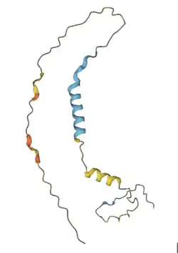 The tertiary structure was viewed through AlphaFold, i-TASSER and annotated with NCBI's iCN3D tool.[17][18] These results are shown in the figures to the right, all of them include similar, or near identical features—two alpha helices and no beta sheets.