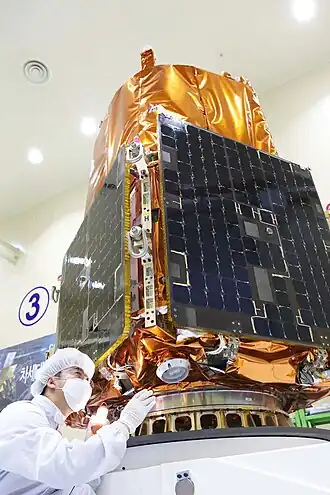 CAS500-1, or Compact Advanced Satellite 500-1 (Korean: 국토위성 1호, transl. "Land Satellite No. 1"), is a prototype 500-kilogram (1,100 lb) class Earth observation satellite that was launched by South Korea at the Baikonur Cosmodrome on 22 March 2021.[2][3] It is in a 500-kilometre (310 mi) Sun-synchronous orbit, inclined by 97.7 degrees or 15 orbits/day.