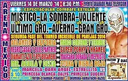 The CMLL Torneo Nacional de Parejas Increíbles 2014 or "National Incredible Pairs Tournament 2014" was the fifth of a series of Lucha Libre (professional wrestling) tournaments for tag teams traditionally held early in the year. The tournament was based on the Lucha Libre Parejas Increíbles match type where two wrestlers of opposite allegiance, portraying either villains, referred to as "Rudos" in Lucha Libre wrestling terminology, or fan favorites, or "Technicos".[1] At times some of the team members were part of pre-existing scripted feuds or storylines with each other.[1] The tournament was won by the team of Atlantis and Euforia, marking the fourth time Atlantis has won the tournament.