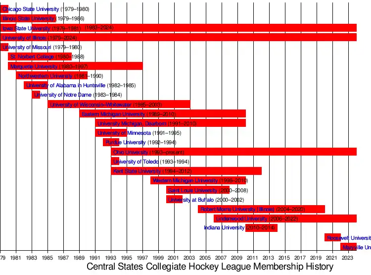 The league saw great expansion in the early 1990s when the University of Michigan-Dearborn joined after operating as an NAIA varsity program.[1] Ohio University followed in 1993 and Kent State University joined in 1994 after the university dropped NCAA hockey.[1] Following the 2003 season, UW-Whitewater departed & dropped down to play ACHA D2. In 2004, Robert Morris University-Illinois joined the league, followed by Lindenwood University in 2006. After the 2008 season, Saint Louis University departed to play at the ACHA Division II level. At the conclusion of the 2009–2010 season, Eastern Michigan University, Michigan–Dearborn, and Western Michigan University left to join the new Great Lakes Collegiate Hockey League.[2] The CSCHL added Indiana University, who joins the league for the 2010–2011 season, after transitioning from ACHA II.[3] Kent State departed for the GLCHL at the conclusion of the 2011–12 season.