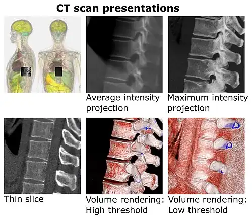 The result of a CT scan is a volume of voxels, which may be presented to a human observer by various methods, which broadly fit into the following categories: