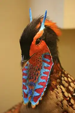 Cabot's tragopan is a plump ground-dwelling bird with relatively short legs. The male grows to a length of about 60 cm (24 in) and a weight of around 1.4 kg (3 lb) while the female is about 10 cm (4 in) shorter and weighs around 0.9 kg (2 lb). The head of the male is black with reddish-orange streaks on either side and on the neck and similar-coloured bare skin on the cheeks and around the eye. Below the beak dangle blue and orange decorative, inflatable wattles and there are a pair of fleshy blue "horns" over the eyes. The upper parts of the body are reddish-brown, with large buff markings and the underparts are straw-coloured. The female is altogether a less-colourful bird. The head and upper parts are reddish-brown spotted with black and marked with triangular-shaped white patches and the underparts are greyish-brown with white markings.[4]