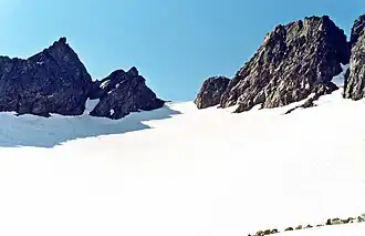 Gunsight Notch, which is lower on the Cache Glacier and should not be mistaken for Cache Col