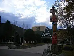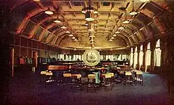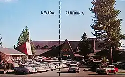 The Cal Neva Lodge and Casino overlooks Lake Tahoe with the property split across the California–Nevada border near Crystal Bay.[56][65] The main dining room has a white line indicating the state border running down the middle of the room.[66] The swimming pool also straddles the state border.[26] The interior is decorated in the lodge-style.[67] The entrance has been replaced several times over the years, although the exterior of the buildings has remained almost the same since the reconstruction.[68] Before the expansion under Sinatra, the lodge had 55 rooms and 11 lodges,[67] but this was increased to 220 rooms following the expansion in 1969.[47][69] As of 1998, it had 182 rooms and suites and eight conference rooms, catering for up to 400 people.[58]
