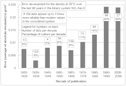 Schott and many scientists and engineers afterwards applied the additivity principle to experimental data measured in their own laboratory within sufficiently narrow composition ranges (local glass models). This is most convenient because disagreements between laboratories and non-linear glass component interactions do not need to be considered. In the course of several decades of systematic glass research thousands of glass compositions were studied, resulting in millions of published glass properties, collected in glass databases. This huge pool of experimental data was not investigated as a whole, until Bottinga,[13] Kucuk,[14] Priven,[15] Choudhary,[16] Mazurin,[17] and Fluegel[18][19] published their global glass models, using various approaches. In contrast to the models by Schott the global models consider many independent data sources, making the model estimates more reliable. In addition, global models can reveal and quantify non-additive influences of certain glass component combinations on the properties, such as the mixed-alkali effect as seen in the adjacent diagram, or the boron anomaly. Global models also reflect interesting developments of glass property measurement accuracy, e.g., a decreasing accuracy of experimental data in modern scientific literature for some glass properties, shown in the diagram. They can be used for accreditation of new data, experimental procedures, and measurement institutions (glass laboratories). In the following sections (except melting enthalpy) empirical modeling techniques are presented, which seem to be a successful way for handling huge amounts of experimental data. The resulting models are applied in contemporary engineering and research for the calculation of glass properties.