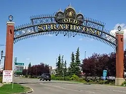 The roadways are the remnant of the northern terminus of the Calgary and Edmonton Trail, a land transport route between the fur trading posts of Fort Edmonton and Fort Calgary, used as far back as the early 1800s.[9] The roadways were originally part of central Strathcona and conformed to the former city's quadrant numbering system, as such 104 Street (Calgary Trail) was known as Main Street and was the division between the west and east quadrants (Whyte Avenue was the division between the north and south quadrants), while Gateway Boulevard was known as 1st Street E.[1] In 1912, Edmonton and Strathcona amalgamated Edmonton adopted its present numbering system; Main Street was renamed as 104 Street while 1st Street E was renamed as 103 Street. As Alberta's highway system developed, 104 Street became part of Highway 1 (renumbered to Highway 2 in 1941) to the 54 Avenue area before shifting to the southeast and continuing south along the CP rail line Edmonton-Calgary line and aligned with 103 Street, going by the name of Calgary Trail.[10]