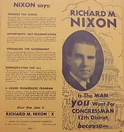 Nixon spent most of 1946 campaigning in the district, and worked hard to extend his name recognition beyond his hometown of Whittier.[87] In 1952, as Nixon ran for vice president, the Madera News-Tribune set forth its view of why Nixon beat Voorhis, "He rang doorbells, he talked on street corners and in auditoriums, he kissed babies, patted old ladies on the cheek, and otherwise made himself known wherever and whenever two people would stop and listen to him. He made friends with the press and radio, he went out of his way to be congenial and likable."[88] Bullock indicated that regardless of the tactics used, Nixon would likely have beaten the incumbent given the national Republican tide that swept the party into power in the House of Representatives for the first time since 1931.[c]