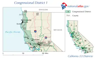 California's 1st congressional district is a U.S. congressional district in California. Doug LaMalfa, a Republican, has represented the district since January 2013. Currently, it encompasses the northeastern part of the state. Since the 2022 election, it includes the counties of Butte, Colusa, Glenn, Lassen, Modoc, Shasta, Siskiyou, Sutter, and Tehama, and most of Yuba County. The largest cities in the district are Chico, Redding, and Yuba City.[1]