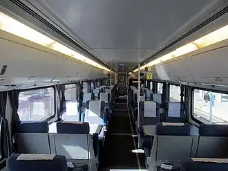 32 coach cars were built for Amtrak California and all are named after California rivers.[8] The coach cars have 76 seats on the upper level, 13 seats on the lower level and one wheelchair position on the lower level.[9] There are 6 workstation tables on the upper level allowing groups of 4 to meet around a table with each other. There also 2 sets of club seating areas without tables where groups of 4 can sit facing each other. At the far ends of each coach car there are single seats on each side of the end door (that allows passengers to pass into another car) with a glass partition (to block noise from the end door). The lower level has two restrooms (one is wheelchair accessible) and a large luggage rack. On Capitol Corridor trains the shelves on the luggage rack are stowed, revealing securements for 3 bikes.