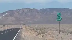 The section of SR 266 from the western terminus to the junction with SR 168 is designated by the California State Legislature as eligible by law for the State Scenic Highway System;[3] but it is not officially designated as a scenic highway by Caltrans.[4] The entire route, consisting of two lanes for two-way traffic, traverses on the flat land in the Fish Lake Valley east of the White Mountains, and it can serve as transportation of agricultural goods between California and Nevada via the route's only junction (SR 168). In the event that SR 168 is closed, SR 266 connects to SR 264, which intersects with U.S. Route 6 (US 6) in order to provide an alternate access to California.[2]