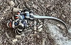 The California mountain kingsnake (Lampropeltis zonata) is a species of nonvenomous colubrid snake that is endemic to North America. It is a coral snake mimic, having a similar pattern consisting of red, black, and yellow on its body, but the snake is completely harmless. Seven subspecies are recognized, with five found in the U.S., including the nominotypical subspecies, and two in Mexico.[1]