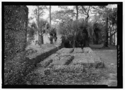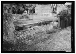 The Callawassie Sugar Works' construction appears to be based on observations made by Thomas Spalding.[6] It incorporated three principal components: a mill, boiling house, and curing shed. The footprint of the buildings suggests that the boiling house and curing shed were aligned in a "T" configuration (little remains of the curing shed). The remaining structures include exterior walls of the one-story buildings with the brick boiling train still evident in the mill. Primitive mills of this kind usually had a set of four kettles arranged in a line, the tops of the kettles being raised from the floor.[3]