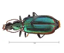 Calleida viridipennis is a carabid beetle, a type of ground beetle. This classification is given to all beetles in the Carabidae family, which belongs to the order Coleoptera. The body size of a carabid beetle is linked with habitat succession and stability. Carabid beetles feed on both animals and plants; however, broader mandibles suggest a preference for plants and seeds. Food preferences may also be linked with other characteristics such as body size or habitat preference. Species with larger eyes seem to prefer diurnal activity. C. viridipennis, having larger eyes, belongs to the diurnal subpopulation of carabid beetles. As a species-rich group, carabid beetles play important roles as bioindicators and mediators of nutrient flows in ecosystems.[6]