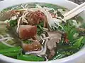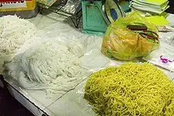 Cambodian noodles are made out of rice, wheat, and tapioca flour (បាញ់កាញ់, bañ kañ) in varying thickness. Wheat noodles, such as the hand-pulled noodles (មី (mii), a loanword from Teochew 面[83]) and the thinner wheat vermicelli (មីសួ, mii suə), have been adopted from the Chinese cuisine and incorporated into distinct Cambodian noodle soups and stir-fries. Rice noodles include the indigenous lightly fermented num banhchok (នំបញ្ចុក), as well as rice vermicelli (គុយទាវ, kŭytéav), banh sung (បាញ់ស៊ុង, bɑɲ song), silver needle noodles (លត, lat), and banh hoi (បាញ់ហយ).