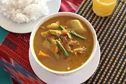 The Khmer term samlor (សម្ល) encompasses a wide variety of stews and curries, which are staples in Cambodian cuisine. These curries are typically served with rice, fresh noodles, or a baguette. and often include seafood, chicken, beef, or pork. Vegetarian Cambodian curries are less common. Popular Cambodian curries are fish amok, num banhchok, kari sach moan, sour beef curry and curry leaf chicken.[85] The word kari (ការី, kari) specifically refers to an Indian-style curry and is believed to be a loanword from Tamil.[86] Curries play an important role in ceremonial occasions in Cambodia and are distinctive for their use of sweet potatoes, setting them apart from other Asian curries.[87]