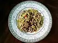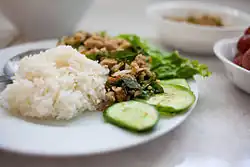 Cambodian stir-fries combine aromatic ingredients with strong flavours, such as lemongrass, galangal, holy basil and garlic. An essential component of Cambodian stir-fry dishes is fish sauce and oyster sauce, which provide a pungent, umami-rich base, balanced by lime juice, palm sugar and other milder ingredients.[85] The Khmer term cha (ឆា), borrowed from Chinese, refers to the method of sautéing or stir-frying, which has been integrated into Cambodian cuisine from Chinese cuisine and can be found as fried rice (បាយឆា, baay chaa) and fried noodles (មីឆា, mii chaa), among others. The Khmer verb kha (ខ), on the other hand, refers to the technique of stewing in soy sauce and could be ascribed to Vietnamese kho.[86]