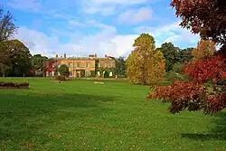 The house is atop a small hill, surrounded by 40 hectares of garden and parkland, and an additional 100 hectares of woodland. The gardens probably date from 1820, and there are two walled gardens to the north of the hall.[1] South of the main building is an ice house, which is also grade II listed. It is built of red brick, and largely covered in earth. It has a circular plan with a brick barrel vaulted entrance passage. Three steps lead down to a circular chamber 8 feet (2.4 m) deep, with a domed roof.[4]