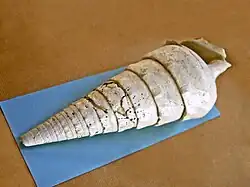 Fossil shell of Campanile auvertianum from France, on display at Galerie de paléontologie et d'anatomie comparée in Paris | |