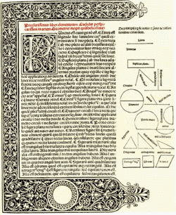 Campanus wrote a Latin edition of Euclid's Elementa in fifteen books. This work by Campanus was influential and was the most frequently used compilation of Euclid until the 16th century.[7] It was based on a compilation by Robert of Chester and also includes material from: Arithmetica by Jordanus de Nemore, commentary on Euclid by Anaritius, and additions by Campanus himself.[7][8] It would later become the first printed edition of Euclid,[7] published by Erhard Ratdolt in Venice in 1482 as Preclarissimus liber elementorum Euclidis perspicacissimi.[9]