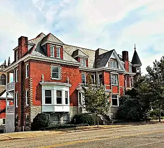Campbell–Hicks House is a historic home located at Huntington, Cabell County, West Virginia. It was built in 1896, and is a 2+1⁄2-story, masonry dwelling in the Queen Anne style. It features a slender, two story cantilevered rounded tower. It also has a full front porch with a roof upheld by five sets of paired fluted columns with Ionic order capitals.[2]