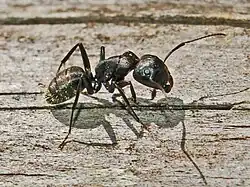 Camponotus vagus is a relatively distinctive species that is easily identified by its large size, uniform black colour, and the long and dense body "hairs" on its exoskeleton. A eusocial insect, individuals have continuous allometric variation in size and morphology to facilitate task allocation and partitioning of work. Workers are 6–12 mm in length.[1] The larger "major workers" act as guards for in defence of the colony and protect the smaller "minor workers" when the latter go foraging outside the nests. The powerful mandibles of the major workers are capable of decapitating smaller arthropods captured as food and dismembering smaller ants of other species.[3]