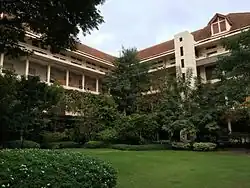 The college's administration had laid out a plan for its physical development in 1913, with the eastern side dedicated to academic and administration buildings, and the western side used for agricultural research.[1] The first permanent structure, the Administration Building, was constructed from 1915 to 1921, and became the university's main building. It was followed by the Science Building in 1929 and Chakrabongse Building (hosting the student clubs) in 1933. These early structures, along with the Auditorium (1939), incorporated Thai-style elements with modern construction methods, in contrast to the increasing adoption of modernist architecture following the abolition of absolute monarchy in 1932, influences of which are seen in the Engineering and Physics buildings (1935), Matthayom Horwang School (1936), Chemistry Building (1940), and the Architecture, Dentistry and Pharmaceutical buildings (1941). The majority of these early buildings saw design contributions by Phra Sarotrattananimman, one of the first formally trained Thai architects.[2]