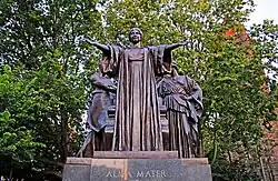 Planted between Altgeld Hall and the Illini Union is the bronze Alma Mater statue by sculptor Lorado Taft. The 10,000-pound statue depicts a mother-figure wearing academic robes and flanked by two attendant male and female figures representing "Learning" and "Labor" after the university's motto. The 1929 statue is iconic for the university and a popular backdrop for student graduation photos.