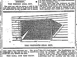 Almost lost in the shuffle of the dissolution of AHAC and the founding of the CAHL was the first use of netting for the goals.[3] Proposed by the Quebec team, a rope was used to connect the tops of the existing goal posts. Attached to the rope and the posts was netting in a pocket, to catch any pucks that entered the net. Nets had been in use for the goals in lacrosse and ice polo.[4] The nets became a permanent part of the CAHL rinks after an exhibition series in 1899.