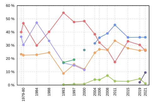 Election | Liberal | Conservative | New Democratic | Green | People's | PC | Reform / Alliance |