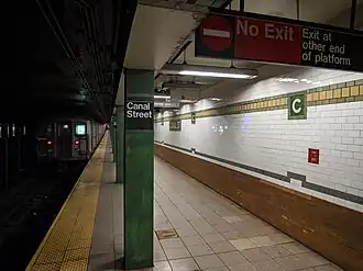 In 1922, the Rapid Transit Commission awarded a contract to the Wagner Engineering Company for the installation of navigational signs at the Canal Street station and several other major subway stations. The IRT platforms received blue-and-white signs, while the BMT platforms received red-white-and-green navigational signs.[92][93] That December, the commission approved a $3 million project to lengthen platforms at 14 local stations along the original IRT line, including Canal Street and seven other stations on the Lexington Avenue Line. Platform lengths at these stations would be increased from 225 to 436 feet (69 to 133 m).[94][95] The commission postponed the platform-lengthening project in September 1923, at which point the cost had risen to $5.6 million.[96][97] The mainline Broadway Line station's platforms originally could only fit six 67-foot-long (20 m) cars. In 1926, the New York City Board of Transportation received bids for the lengthening of platforms at nine stations on the Broadway Line, including the mainline station at Canal Street, to accommodate eight-car trains. Edwards & Flood submitted a low bid of $101,775 for the project.[98] The BMT platform-lengthening project was completed in 1927, bringing the length of the platforms to 535 feet (163 m).[99][100] The commission ordered the BMT to install additional signs at the Canal Street BMT stations in mid-1930.[101]