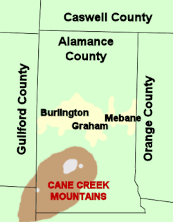![]() Location of Cane Creek Mountains in Alamance County in North Carolina | |