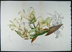 Herb up to 3 m with stout, erect stems. Leaves large, oblong, acuminate. Flowers 10–13 cm. (4-5") long, honeysuckle-scented, borne in a short, terminal raceme; perianth tubular, the three outer petaloid lobes linear-oblong, convolute, reflexed, tinged green, the three inner ones straight and extended, recurved at end, white, tinted yellowish-green.