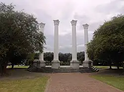In anticipation of a Confederate reunion, Charleston's city council decided to spend $30,000 to build a convention hall.[4] Fifteen plans were submitted for the new facility, and those of Charlotte, North Carolina architect Frank Pierce Milburn were selected.[5] The hall, with seating for 7000, was completed and handed over to the City Council on April 27, 1899.[6] After the Confederate reunion, the hall was used infrequently and never to capacity. In October 1901, the City Parks Commission leased the auditorium to William P. Dowling, Jr. for a term of three years for use as a theater.[7] In December 1904, the city council chose to use the building as a temporary location for the city hospital.[8] In January 1907, the city council agreed to lease the hall to the College of Charleston to house its museum, thereafter known as the Charleston Museum, for a nominal rent.[9][10] In October 1981, a fire destroyed the hall about one year after the museum moved to Meeting Street, leaving only its four grand columns.[11]