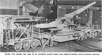 The carriages consisted of rectangular steel bases, which were suspended on two railroad bogies. Each bogie had six axles.[3] The number of axles was determined by the weight limit for European railways of 17 tonnes (19 short tons) per axle.[1] Since the barrels were naval guns that were not intended for use at high angles of elevation the trunnions were relocated relatively far forward and the guns were nose heavy.[3] The carriage used ground platform anchoring and site preparation included laying wooden beams parallel to the tracks then splicing in a section of rail bed reinforced with wooden beams under the center which the carriage was lowered onto.[2] Outriggers and ground anchors were also used to stabilize the gun once in firing position as well as screw jacks. Although the mount was capable of 360° of traverse it was often limited to 10° left/right of the centerline because of problems with balance and recoil.[3] Another issue for the mount was that although the gun could be elevated up to +40° it was limited to +20° of elevation when the gun was fired parallel to the tracks due to recoil. For these reasons, the weapon was not considered a success.[2] The carriages were originally deployed in 1916 but it was too much gun for too little carriage so the 305 mm (12 in) barrels were later replaced with 240 mm (9.4 in) barrels by St Chamond and the Canon de 240 modèle 93/96 TAZ entered service in 1918.[3]
