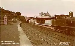 Canterbury Station was expanded in 1915 in conjunction with construction of the Metropolitan Goods line. To the north of the station, lie two tracks that are part of the Goods Line. The westbound line has a platform face that has been fenced off. A platform on the eastbound line was demolished in 1995. These were previously used for raceday specials when Canterbury Park Racecourse was operating. Several sidings were located just beyond the station for stabling raceday trains.[3][5][6]