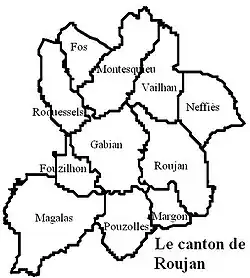 The canton de Roujan is a former canton in the Arrondissement of Béziers, Hérault department, and Languedoc-Roussillon region of France. It had 9,414 inhabitants (2012).[1] It was disbanded following the French canton reorganisation which came into effect in March 2015. It consisted of 11 communes,[1] which joined the canton of Cazouls-lès-Béziers in 2015.[2]