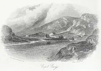 Capel Curig (Welsh pronunciation: [ˈkɑːpɛl ˈkɨːrɪɡ]; meaning "Curig's Chapel") is a village and community in Conwy County Borough, Wales. Historically in Caernarfonshire, it lies in the heart of Snowdonia, on the River Llugwy, and has a population of 226,[1] reducing slightly to 206 at the 2011 census.[2] It lies at the junction of the A5 road from Bangor and Bethesda to Betws-y-Coed with the A4086 road from Caernarfon, Llanberis, Pen-y-Pass and Pen-y-Gwryd. It is surrounded by hills and mountains, including Moel Siabod and Pen Llithrig y Wrach.