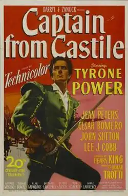 Captain from Castile is a 1947 American historical adventure film. It was released by 20th Century-Fox. Directed by Henry King, the Technicolor film stars Tyrone Power, Jean Peters, and Cesar Romero. Shot on location in Michoacán, Mexico, the film includes scenes of the Parícutin volcano, which was then erupting. Captain from Castile was the feature film debut of Jean Peters, who later married industrialist Howard Hughes, and of Mohawk actor Jay Silverheels, who later portrayed Tonto on the television series The Lone Ranger.