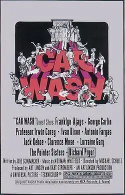Car Wash is a 1976 American comedy film directed by Michael Schultz from a screenplay by Joel Schumacher, and starring an ensemble cast. Originally conceived as a musical, the film is an episodic comedy about a day in the lives of a close-knit group of employees at a Los Angeles car wash. It features Franklyn Ajaye, George Carlin, Irwin Corey, Ivan Dixon, Bill Duke, Antonio Fargas, Jack Kehoe, Clarence Muse, Lorraine Gary, The Pointer Sisters, Richard Pryor, and Garrett Morris.[2]
