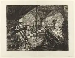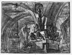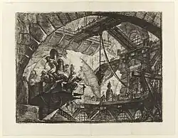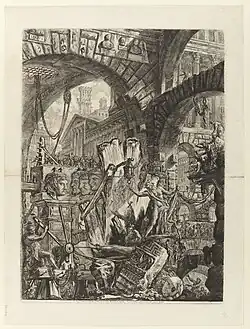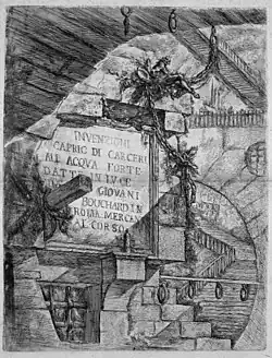 Carceri d'invenzione, often translated as Imaginary Prisons, is a series of 16 etchings by the Italian artist Giovanni Battista Piranesi, 14 produced from c. 1745 to 1750, when the first edition of the set was published. All depict enormous subterranean vaults with stairs and mighty machines, in rather extreme versions of the capriccio, a favourite Italian genre of architectural fantasies; the first title page uses the term.