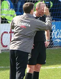 In August 2000, Lebanese businessman Sam Hammam purchased control of the club and replaced Steve Borley as chairman.[37][38] Shortly after taking over, he controversially pledged to get the entire Welsh nation to support Cardiff by renaming the club "The Cardiff Celts" and changing the club colours to green, red and white.[39] After lengthy talks with senior players and fans, he decided the best policy was not to change the name of the club. The club crest was redesigned; the new design incorporated the Cardiff City bluebird in front of the Flag of Saint David and featured the club's nickname superimposed at the top of the crest.[40] Hammam funded the transfers of several new players to the club, and new manager Lennie Lawrence guided Cardiff to promotion when they won the Second Division play-off in 2003 against Queens Park Rangers.[41] Substitute Andy Campbell came off the bench to score the only goal in extra time and ensure Cardiff's return to Division One after an 18-year absence.[37]
