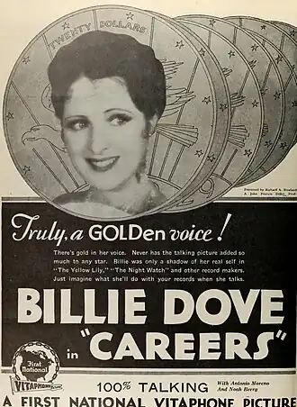 Careers is a 1929 American all-talking pre-Code drama film directed by John Francis Dillon and produced and released by First National Pictures. It stars Billie Dove and features Antonio Moreno, Thelma Todd, and Noah Beery. The film was based on a 1924 German play entitled Karriere, written by Alfred Schirokauer and Paul Rosenhayn.[2]