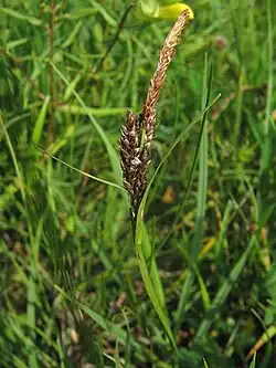 Carex panicea, commonly known as carnation sedge, is a plant species in the sedge family, Cyperaceae. It is known as grass-like sedge and can be found in Northern and Western Europe, and also in north-eastern North America.[1][2] The plant produces fruits which are 3–4 millimetres (0.12–0.16 in) long, are egg shaped and spiked. Both male and female species leaves are pale blue on both sides.[3]