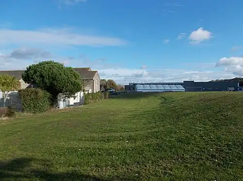 Carisbrooke Station[1] was a railway station situated near the village of Carisbrooke,[2] just outside Newport, Isle of Wight, off the south coast of England. It was an intermediate[3] station on the Freshwater, Yarmouth and Newport Railway. It originally had 2 platforms but one platform was abandoned in 1927. It was a busy station for the nearby castle until the advent of the bus routes,[4] but little used thereafter.[5] Closed in 1953,[6] its goods yard was by then derelict and overgrown[7] (its only recent use having been by prisoners during World War II[8]). The station has long been demolished and the site is no longer clearly discernible within a school playing field amongst modern development.[9]