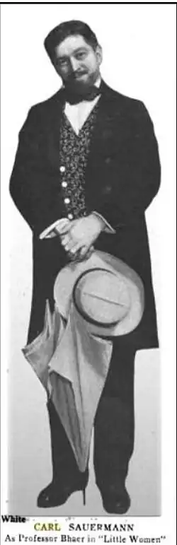 Carl Sauerman (c. 1868, Stockholm - 9 April 1924, Brooklyn, New York) was a Swedish-born actor of the stage and screen. He began his career as a leading stage actor in Berlin before moving to New York City in 1908 to become a member of the German-language theatre company at the Irving Place Theatre. He is best remembered for creating the role of Professor Friedrich Bhaer in the original production of Marian de Forest's Little Women; an immensely popular stage adaptation of Louisa May Alcott's novel of the same that played on Broadway and toured the United States in 1912–1913. In addition to starring in plays on Broadway, he was a silent film actor.