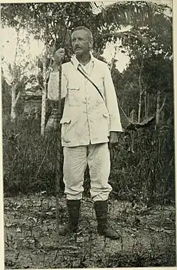 He received numerous financial grants from geographical institutions (Norwegian Geographical Society, the Royal Geographical Society of London and the Koninklijk Nederlandsch Aardrijkskundig Genootschap), but his journey was complicated by the outbreak of the First World War which made it difficult to acquire a military escort.[5][6] He originally had planned to explore New Guinea, but this was rendered impossible by the war.