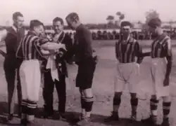 ![]() Castañeda as captain of Betis receiving a bouquet from Espanyol goalkeeper Ricardo Zamora in 1925. | |||
