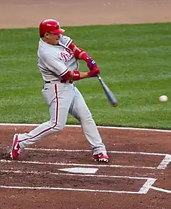In the 2013 season, Ruiz compiled a .268 batting average, five home runs, and 37 RBIs in 92 games, his lowest major league total since 2006.[32] After the season, Ruiz became a free agent. He re-signed on November 21, 2013, to a three-year contract worth US$26,000,000 plus a club option for a fourth season, giving the Phillies have an option to bring Ruiz back for a fourth season, at their discretion.[43] Though one writer suggested his 2013 year might just have been an "aberration",[44] most thought the Phillies overpaid to keep Ruiz, who turned 35 during the subsequent offseason.[45][46][47]