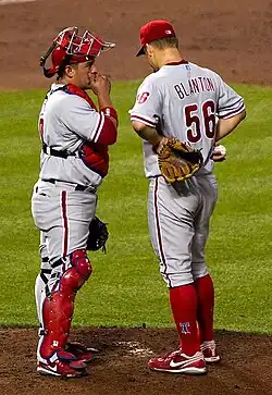 In 2010, Ruiz had a season filled with "indelible moments".[24] He was catcher for Roy Halladay's perfect game on May 29, 2010, against the Florida Marlins and Halladay's no-hitter against the Cincinnati Reds in the first game of the National League Divisional Series on October 6, 2010,[25] the first time a catcher had caught two no-hitters in one season since 1972.[26] On May 4, he hit a walk-off home run, the second of his career, to lead the Phillies over the St. Louis Cardinals.[27] Ruiz spent time on the DL in late June and early July with a concussion, but according to manager Charlie Manuel returned with a more efficient swing that allowed him to hit better against power pitchers.[24] He led the team with a .302 batting average and a .400 on-base percentage. Both statistics also led National League catchers,[6] and he even received a few votes for NL most valuable player.[28] During the 2010 postseason,[b] he did not perform as well as in past years—in nine games, he hit .192 with two home runs and four RBIs.[29] Fans voted Ruiz the "X-Factor Player of the Year" in MLB's This Year in Baseball Awards.[30] He also received the Pride of Philadelphia Award from the Philadelphia Sports Hall of Fame. Halladay called Ruiz a "rock" behind the plate, and presented him with a replica of his Cy Young Award.[31]