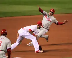 Despite his struggles at the plate during the regular season, Ruiz was an integral part of the Phillies' postseason success.[14] After the Phillies clinched the 2008 National League Championship Series, he commented that the glory of winning a crucial baseball game that clinched the series, which he had witnessed while growing up in Panama on television, "happened to me", noting the aura of the moment, and that it culminated and validated the hard work he had put in over the years.[15] Subsequently, in game 3 of the 2008 World Series, Ruiz tapped a ground ball up the third-base line for a walk-off infield single, the first in MLB history.[14] Ruiz noted, "I heard them cheering. And that's when I knew, 'Okay it's over' ... I'll take a win."[16] The Phillies eventually won the World Series for the first time since 1980, doing so in five games, the last of which began on October 27 and ended on October 29 after it was suspended part-way through due to rain.[17][18] For his performance in the playoffs, he earned the nickname "Señor Octubre" (Mr. October in Spanish).[2]
